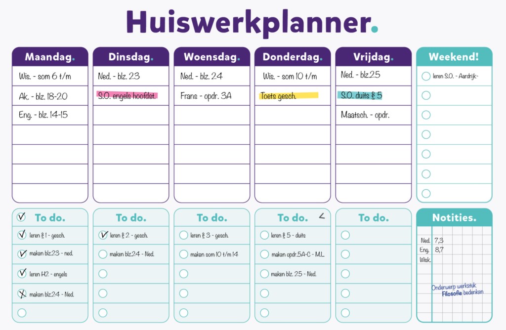 Als je een planning wil maken moet je natuurlijk dat niet op de avond van tevoren doen, want dan heb je dr nogsteeds niet veel aan. Ik zou 1 week van tevoren de planning maken. Maar nu vraag je je natuurlijk af “Hoe moet ik dan beginnen?” Ik schrijf altijd eerst al mn huiswerk op en voor wanneer ik het af moet hebben. Daarna ga je een schema maken en invullen. Hieronder zie je een voorbeeld van een planner. persoonlijk vind ik deze fijn om te gebruiken, omdat deze zeer overzichtelijk is. Natuurlijk kan je ook gewoon een planner in de winkel kopen, bij de action of hema bijvoorbeeld.